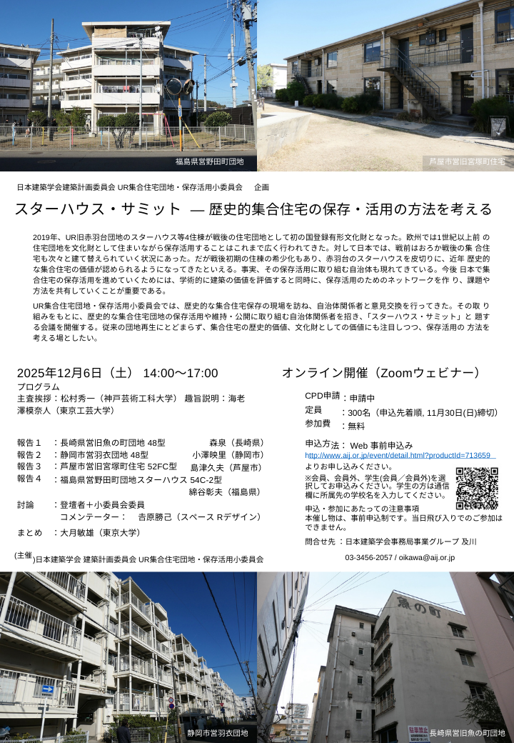 2025年12月6日(土)に開催する「スターハウス・サミットー歴史的集合住宅の保存・活用の方法を考える」では、オンラインにてご視聴いただけます。